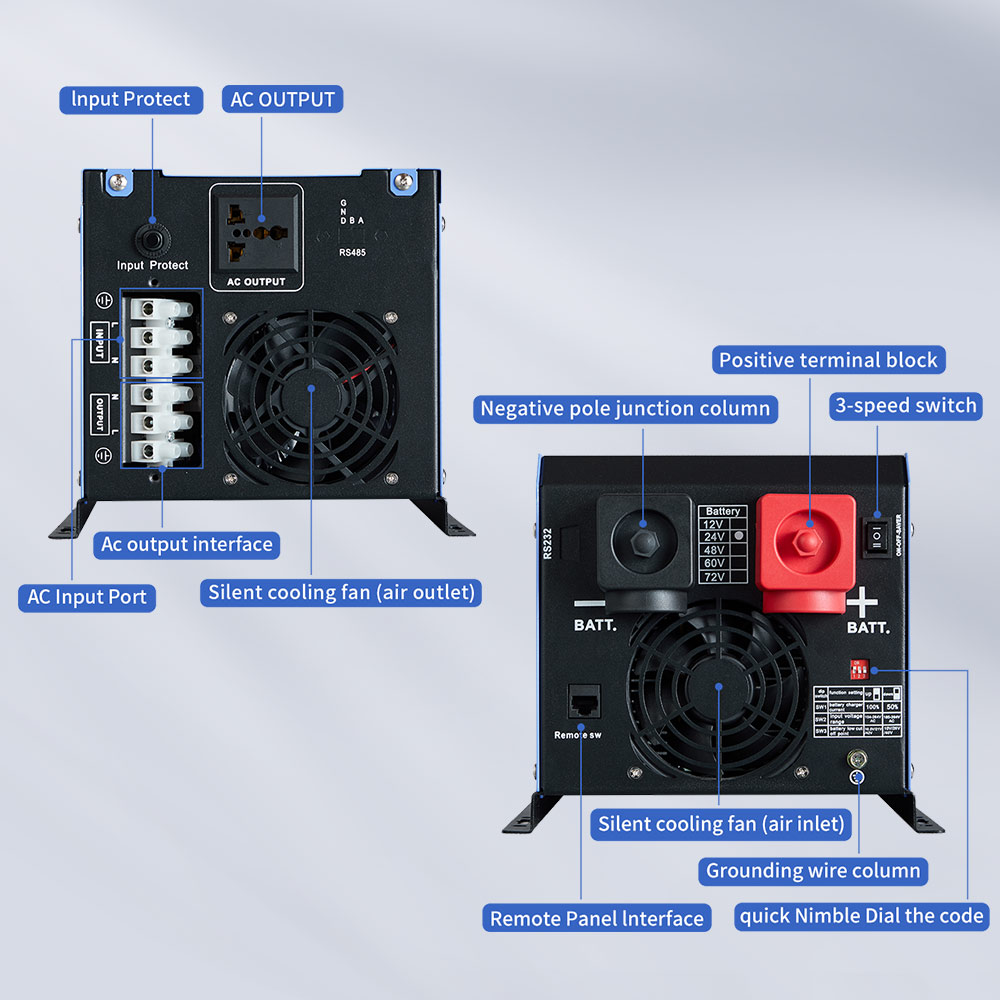 ● 12V 24V 48V1KW-3KW পাওয়ার ফ্রিকোয়েন্সি সাইন ওয়েভ ইনভার্টার: 7 ওয়ার্কিং মোডগুলি, মেইনস \ সৌর \ শক্তি-সেভিং মোডে, সমস্ত অপ্রচলিত, জেনারেটর, ব্যাকলাইট এবং আউটপুট মোডের সাথে সামঞ্জস্যযোগ্য যখন প্রয়োজন হয়; নতুন স্থিতি প্রদর্শন বার, স্ব-চেক ফল্ট, পুনঃসূচনা ফাংশন;