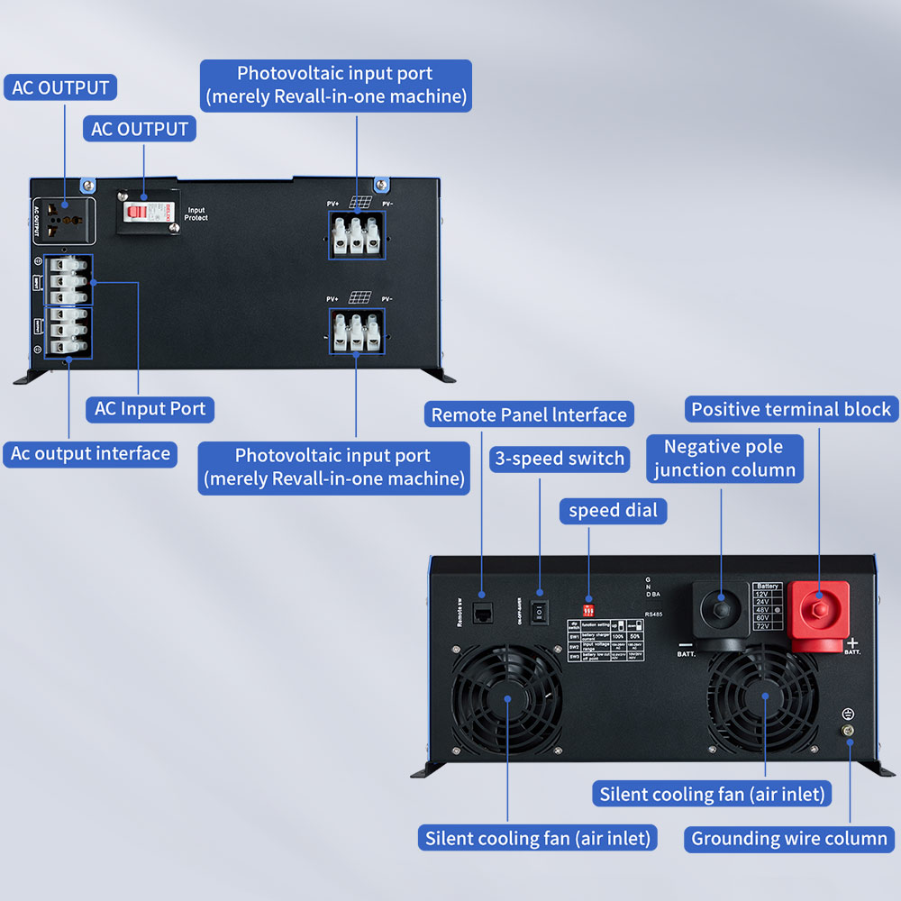 সংযোগযোগ্য ভোল্টেজ পরিসীমা (সীসা-অ্যাসিড ব্যাটারি) | 70A-12V/24V/48V/60V/72V: 0-960W/1920W/3840W/4800W/5760W | ||||||